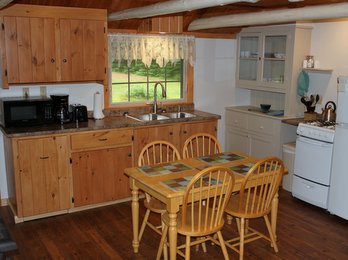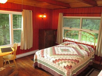 Ruska – “Fall Foliage”. 3 bedroom; 1 bath (650 sq. ft.) and accommodates up to six guests. Located near the start of the Lake Trail. There is one queen bedroom, one double bedroom, and the third bedroom has a set of bunk beds. Woodstove is glass front.